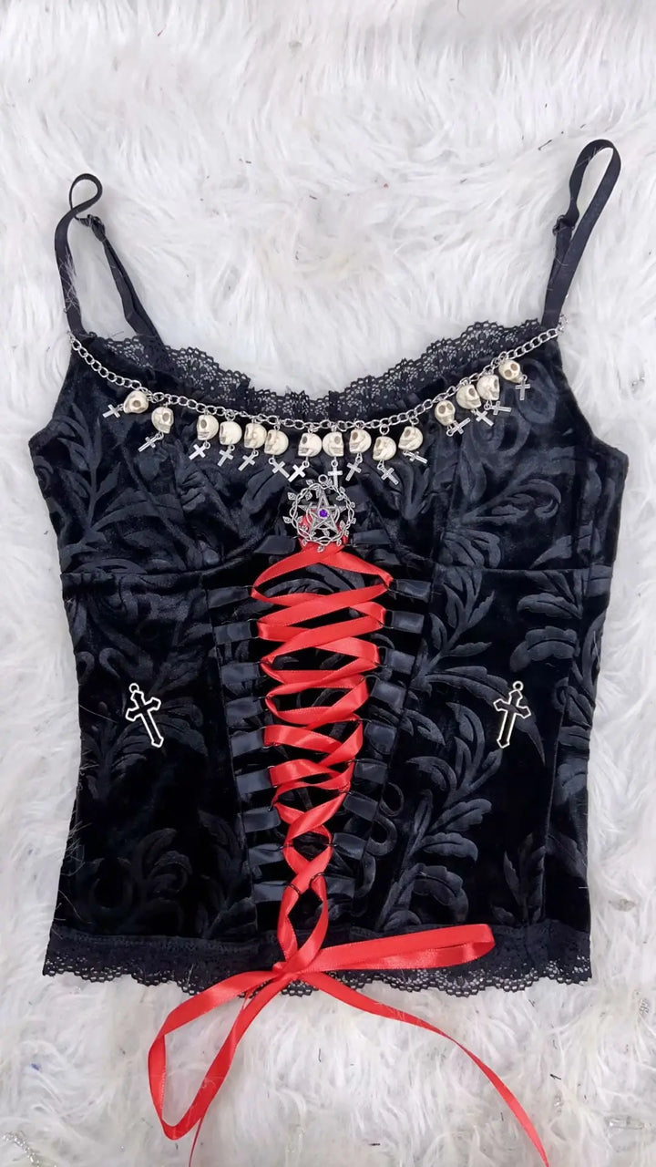 Elevate your dark aesthetic with the Velvet Bloodlace Gothic Corset Tank, a stunning mix of soft black velvet, bold red lacing, and silver gothic charms. This top blends romantic gothic beauty with rebellious edge, creating a silhouette that’s both feminine and dangerous.