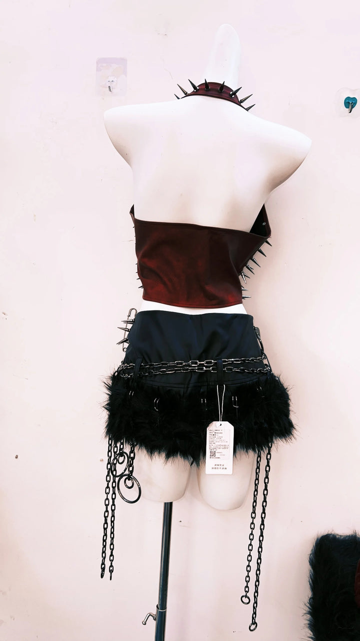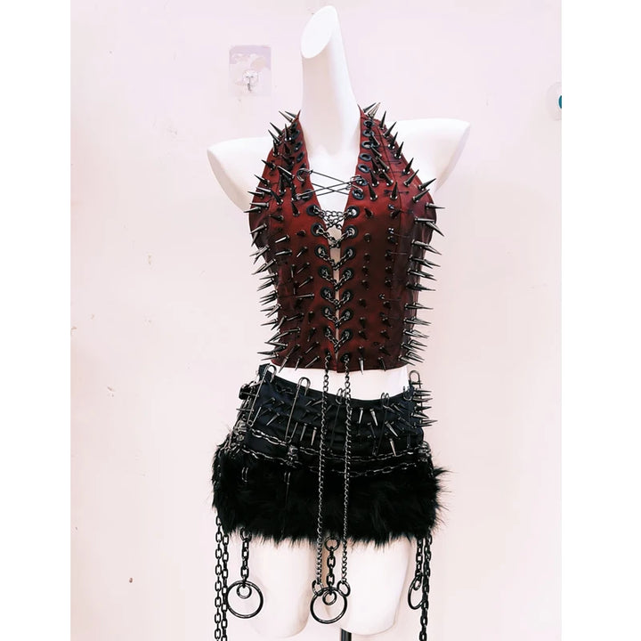 The spiked halter top is laced with heavy metal hardware, giving a razor-sharp silhouette that radiates danger and confidence. Paired with the fur-trimmed mini skirt wrapped in chains, rings, and layered straps, this outfit is pure rebellion in fashion form.
