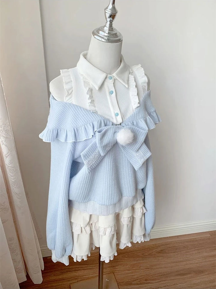 The set features a ruffled white blouse layered under a pastel-blue off-shoulder knit, complete with a big coquette bow and a fluffy pom detail that adds instant soft-girl charm. Paired with the cream ruffle mini skirt, the whole outfit creates that airy, delicate silhouette that looks perfect in mirror selfies, cozy aesthetic reels, or soft winter edits. The textures are warm, plush, and gentle — making you feel like a blueberry cream puff.