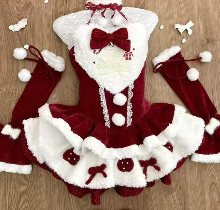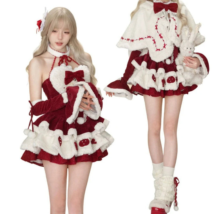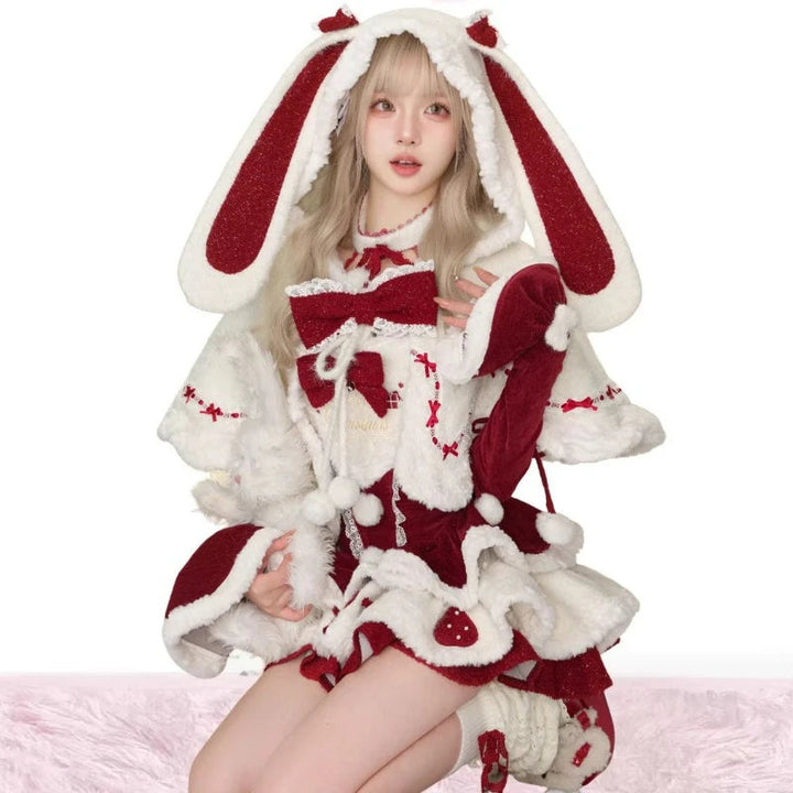 This irresistible set features adorable bunny ears, heart-shaped stitching, fluffy paw accents, and playful pom-pom ties that make every twirl extra enchanting. Whether you are sipping hot cocoa at home, creating dreamy winter photoshoots, or heading out for a kawaii holiday look, this outfit keeps you cute and cozy ❄️🐇🍒