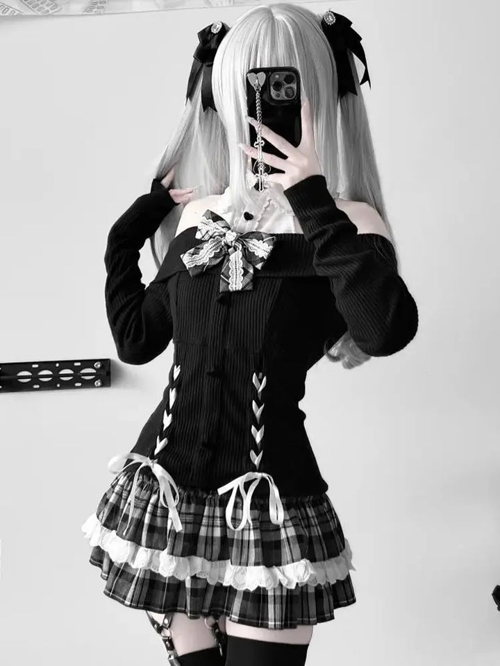 With its sculpted corset-style top, lace-up details, and layered plaid skirt, this outfit creates the perfect silhouette for photos, school-core looks, and alt fashion moments.