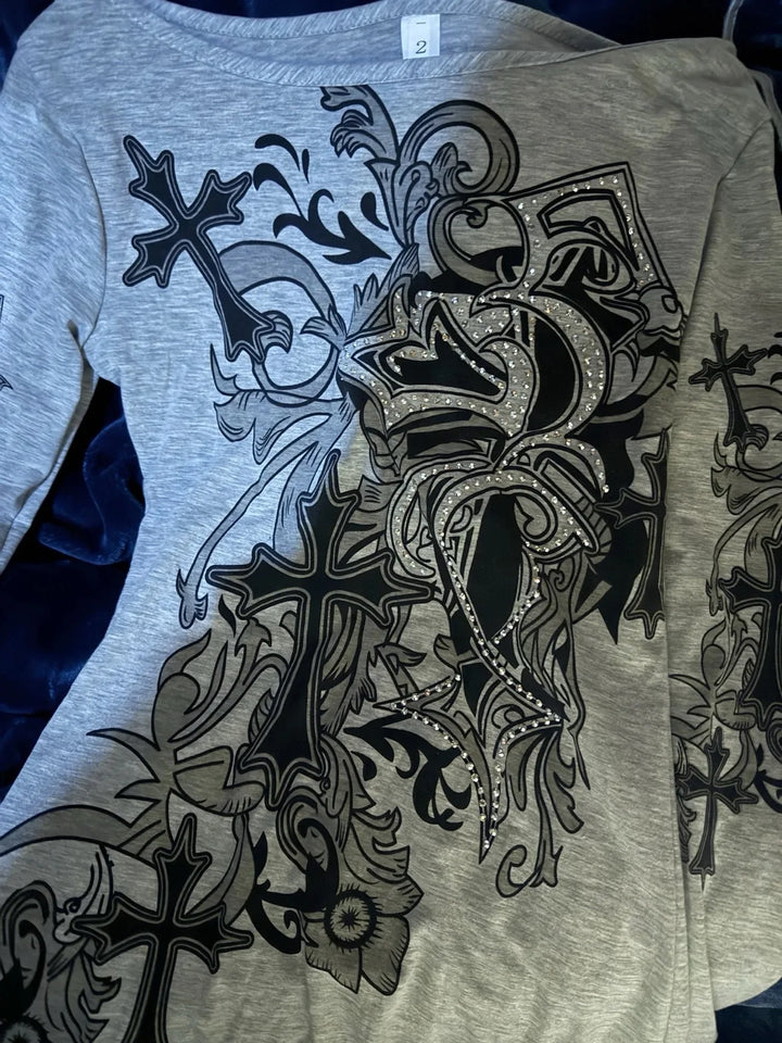A striking rock-inspired long sleeve top featuring a bold gothic cross print that instantly transforms your outfit. The soft, lightweight fabric and relaxed fit give it that effortless "model-off-duty" look while the detailed artwork adds a dramatic edge.
