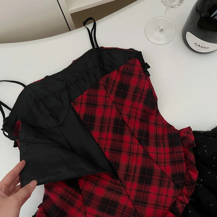 ✔ Red plaid corset-style dress with lace + layered ruffle skirt