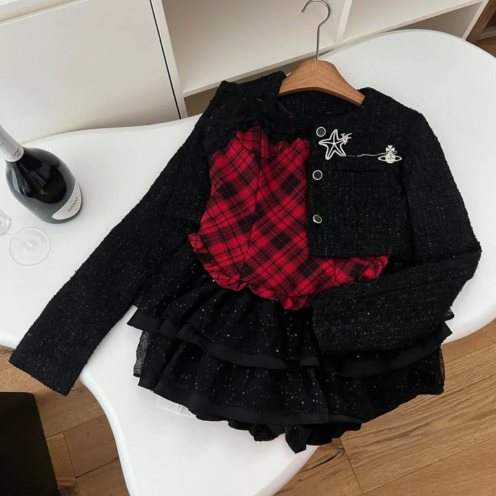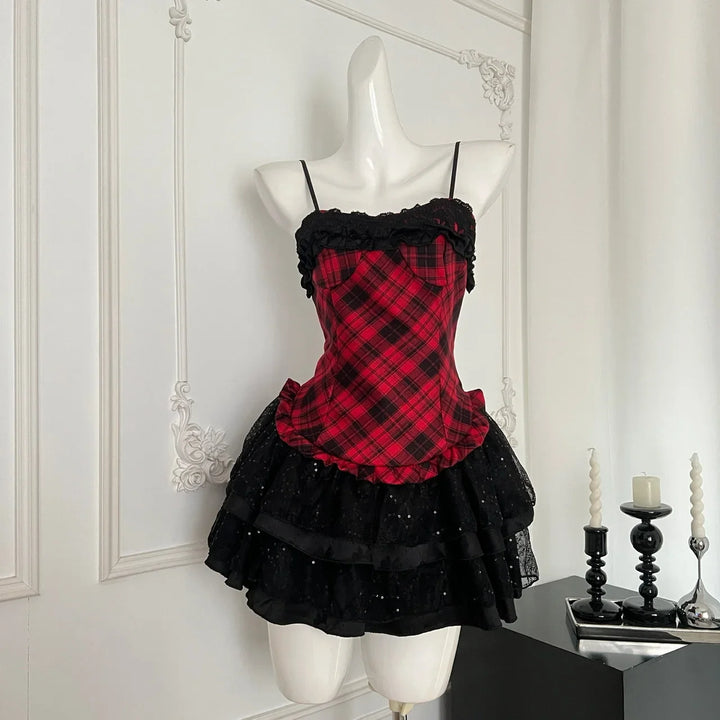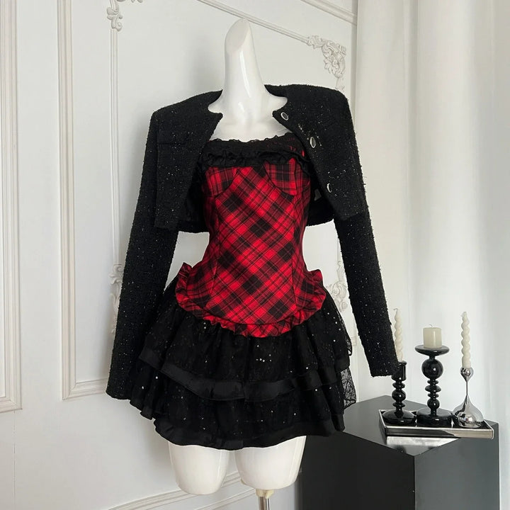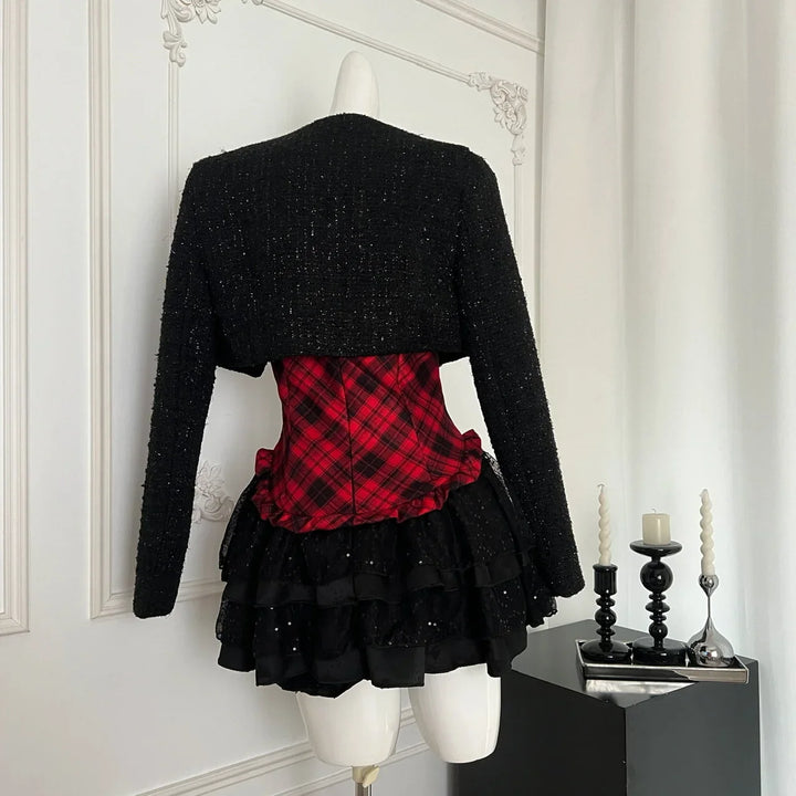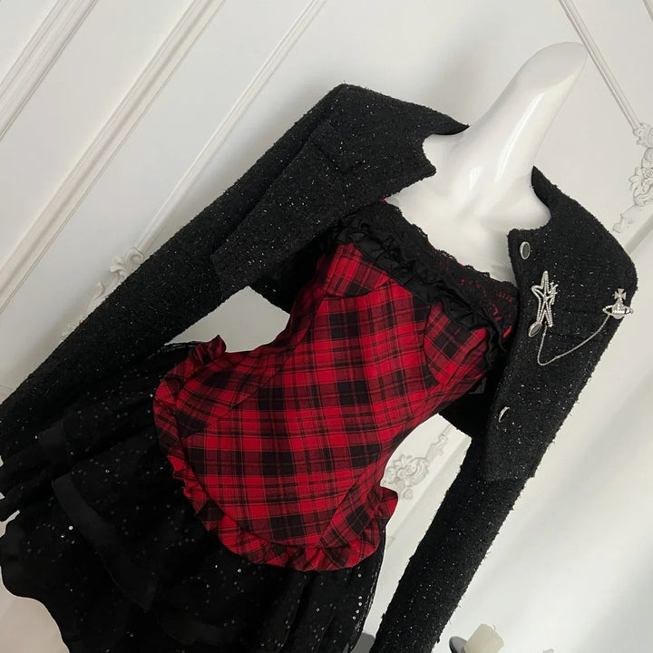 This striking set blends gothic elegance with rebellious charm, featuring a bold red plaid corset dress paired with a sparkly black cropped jacket. Dramatic ruffles, glitter textures, and delicate star accents make it a show-stopping look for anyone who loves dark feminine fashion.