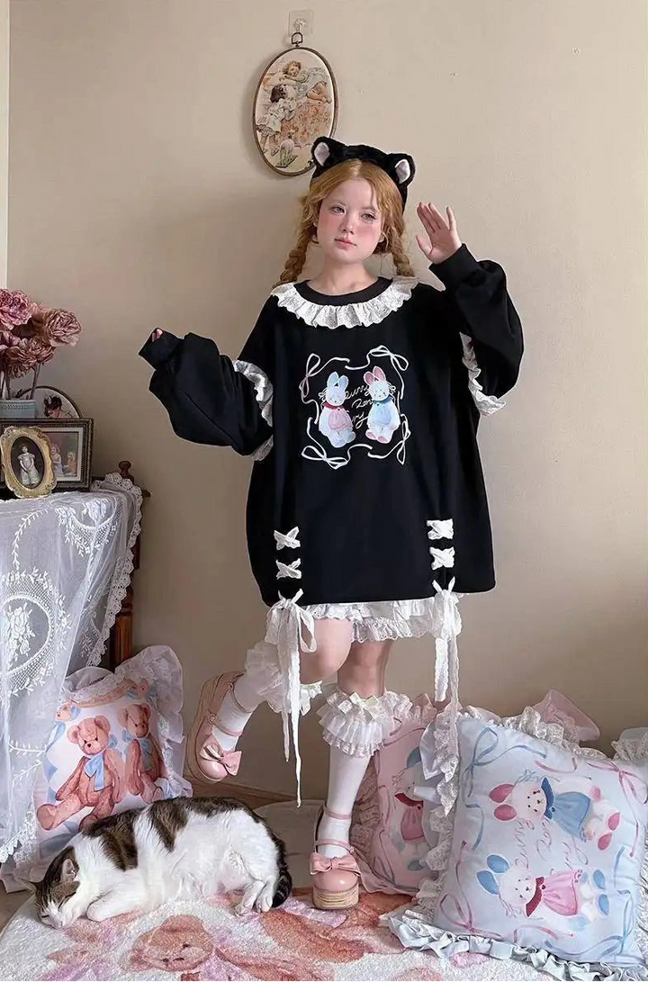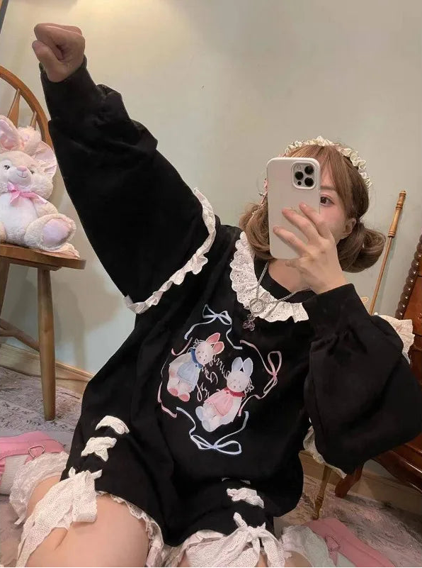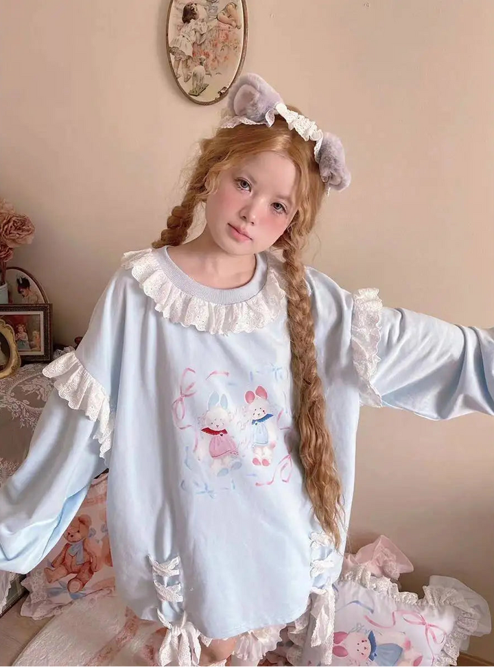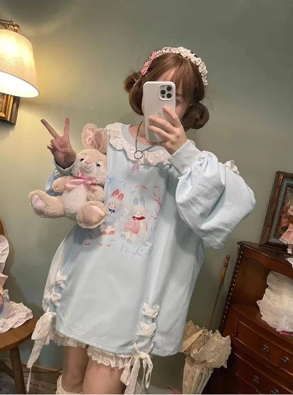 Soft, frilly, and full of dreamy doll-like charm, this long-sleeve top is the perfect cozy-cute piece for anyone obsessed with kawaii and soft lolita aesthetics. With its puffed sleeves, lace ruffles, and adorable bunny graphics, it creates the ultimate sweet-girl silhouette. (。>_<。)♡