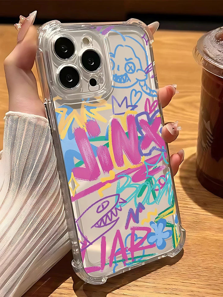 • Striking Jinx Artwork – Full-color illustration of Jinx paired with graffiti tags, neon doodles, and chaotic symbols ✧彡.