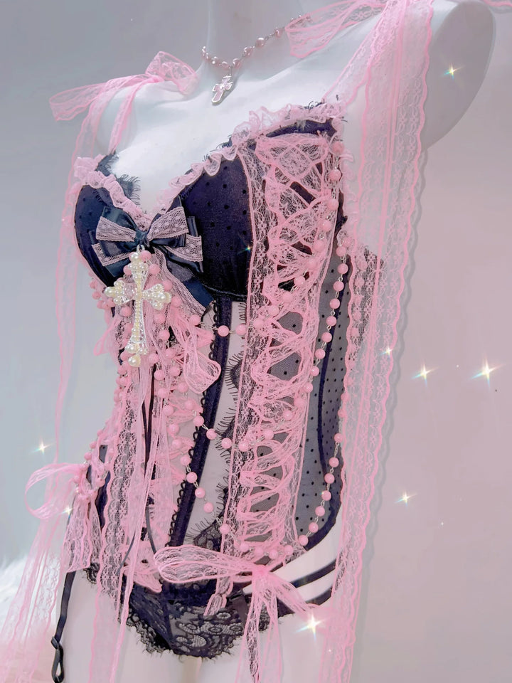 The Enchanted Rosy Lace Seraph Corset Top blends soft coquette beauty with gothic charm, fairycore sweetness, and a touch of dreamy dollette elegance. The pink lace draping falls like angelic ribbons, while the deep black base adds a bold grunge contrast that makes the entire piece feel magical and dramatic.
