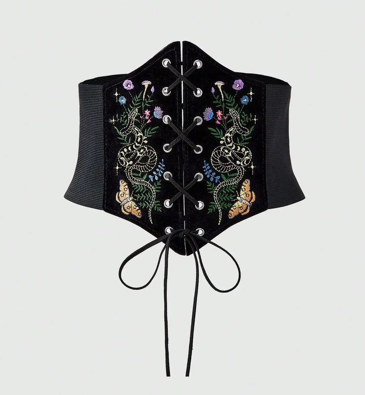 The velvet front panel features intricate gold serpents coiled between embroidered flowers, creating a striking mix of danger and soft enchantment. Satin lacing pulls the waist into a graceful hourglass shape, while the stretchy side bands make it comfortable and easy to wear. Every stitch, symbol, and flourish adds a storybook level of detail, turning the belt into a true statement piece.