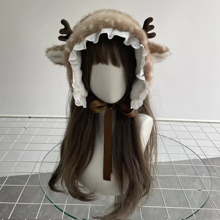🦌 Fawn Hood With Antlers — plush ears, little antlers, lace trim, and a ribbon bow for the ultimate forest-fairy charm