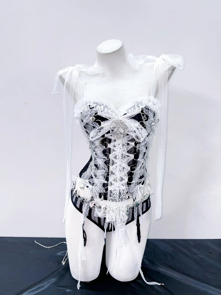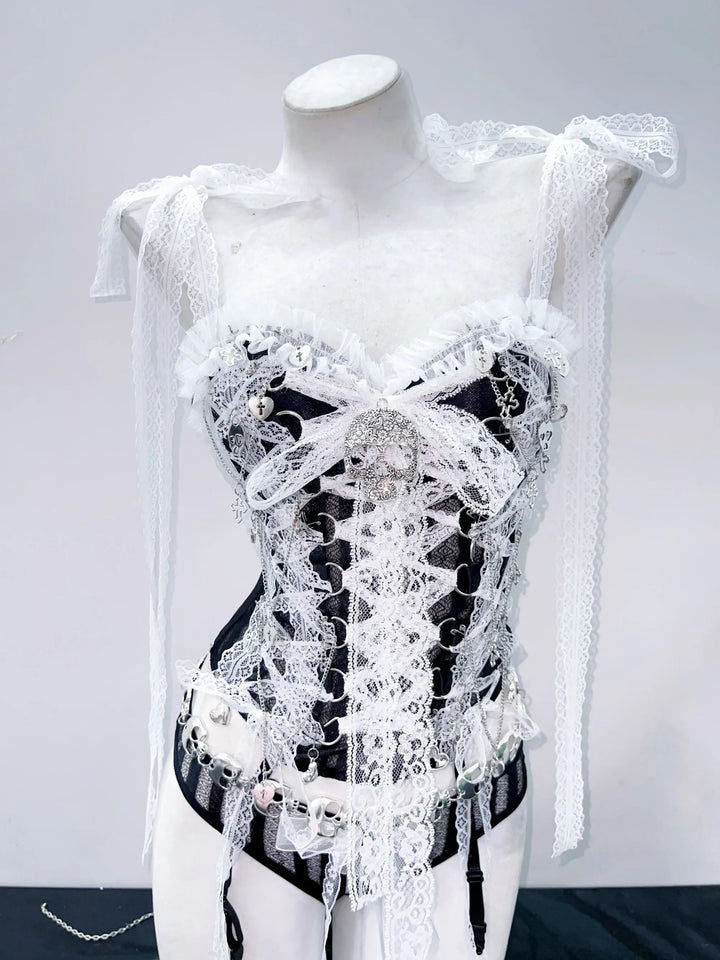The white lace overlays deep black panels for striking contrast, highlighting every detail. Sheer lace sleeves drape delicately off the shoulders, adding an ethereal, snow-fairy touch. Finished with silver hardware and adjustable straps, this piece is both magical and bold.
