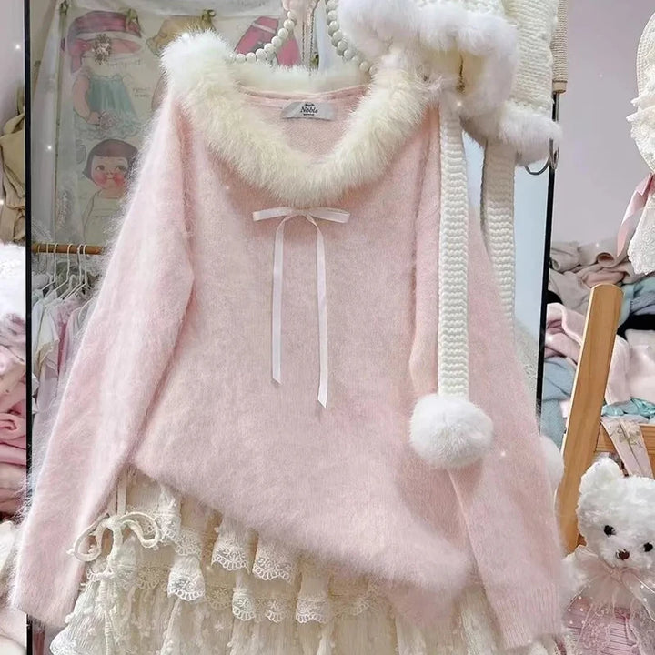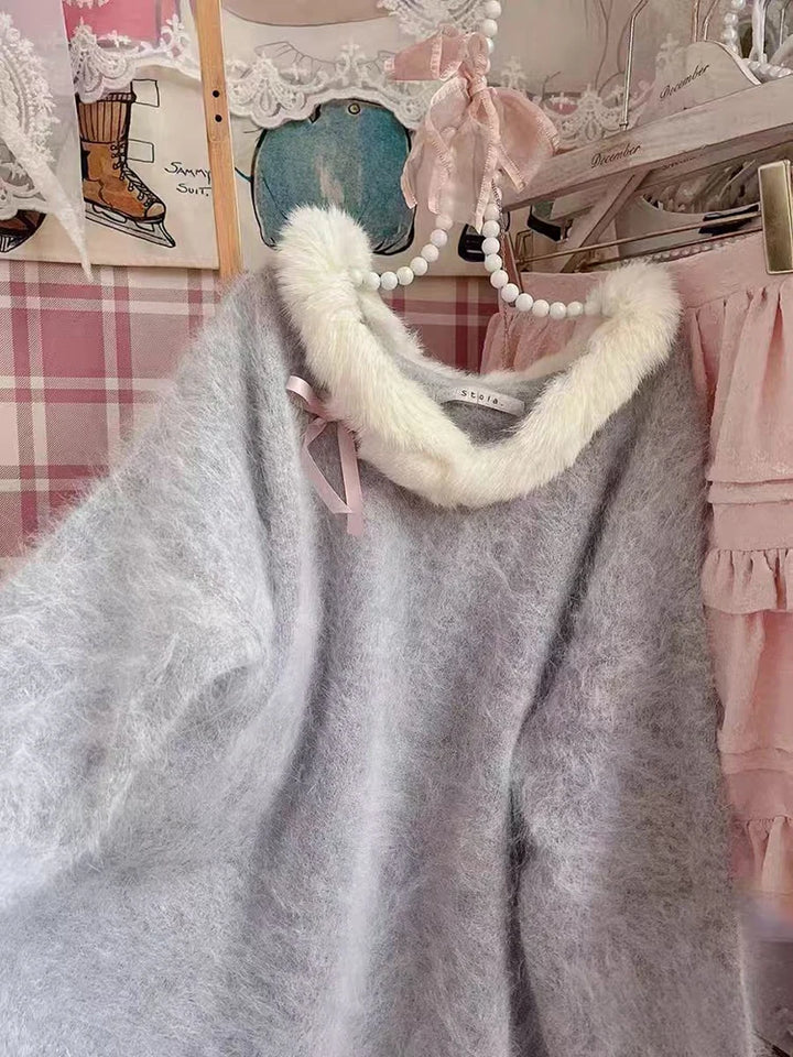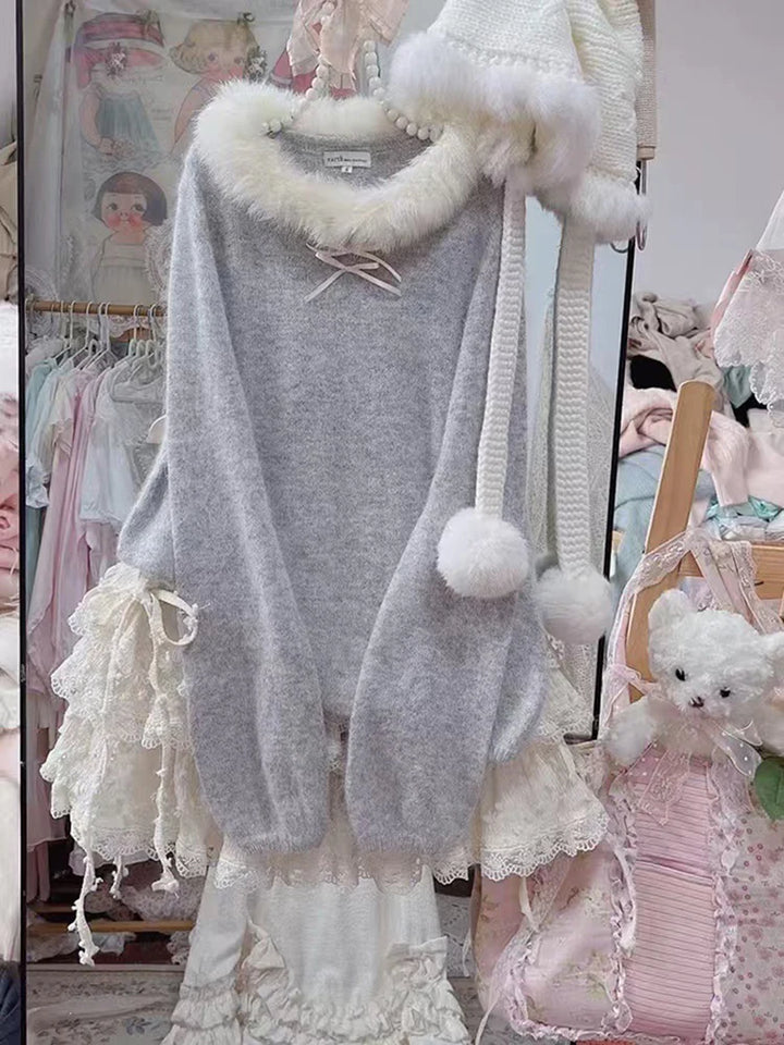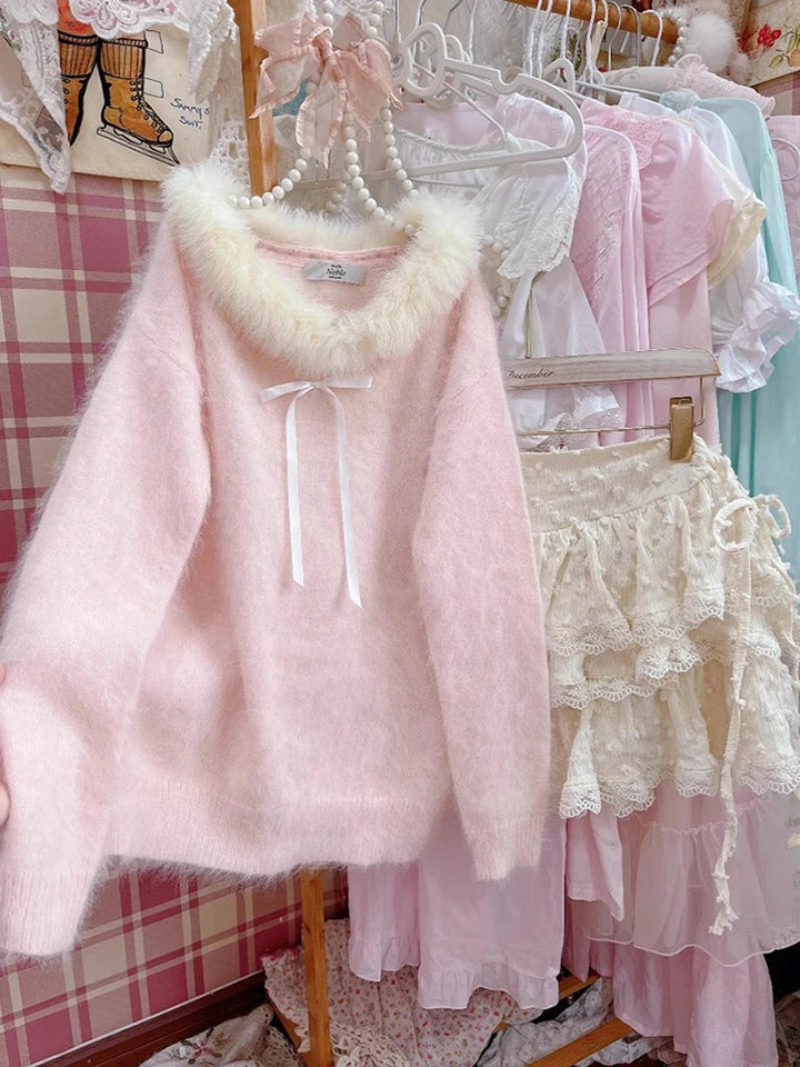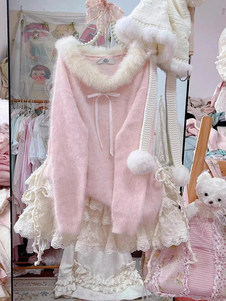 Wrap yourself in dreamy softness with the Fuzzy Bow Lace-Trim Sweater ♡ This cozy knit captures a fairytale aesthetic with its plush, fluffy texture and delicate ribbon bow accent (´。• ᵕ •。`) ♡ The faux fur neckline adds an elegant vintage charm, making it perfect for layering over lace skirts or dresses for a truly coquette-inspired winter look ❄️