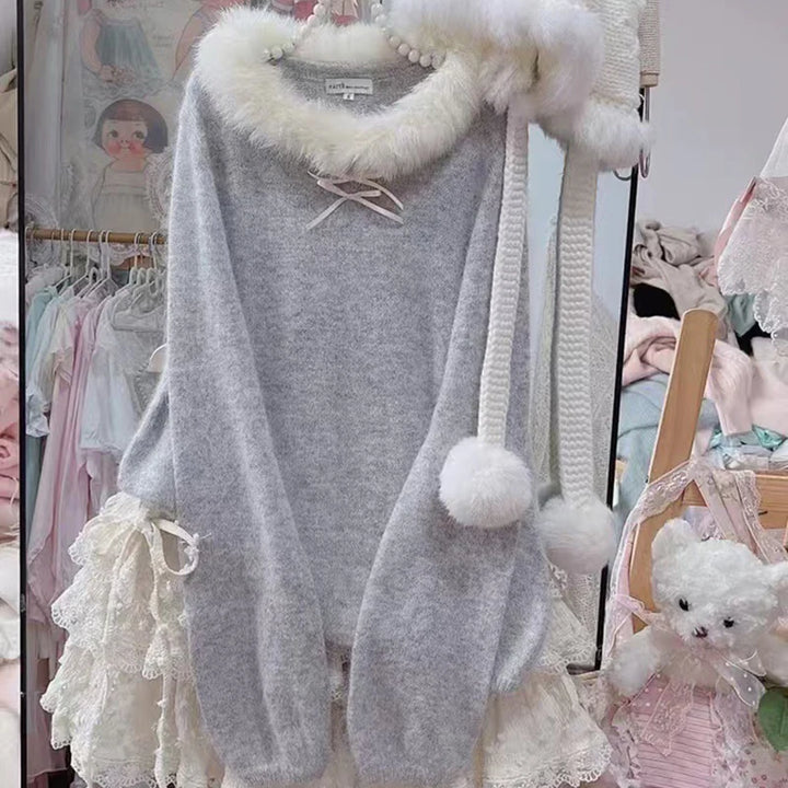 ✩₊˚⊹♡ Fuzzy Bow Lace-Trim Sweater ♡⊹˚₊✩