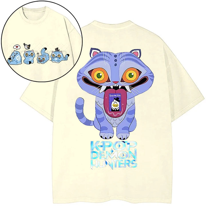 Bring chaos, charm, and a whole lot of attitude with the K-Pop Demon Hunters Derpy T-Shirt ₊˚⊹♡ Featuring a hilariously expressive cartoon demon cat that perfectly captures that “unhinged but cute” energy, this tee is the definition of chaotic K-pop idolcore.