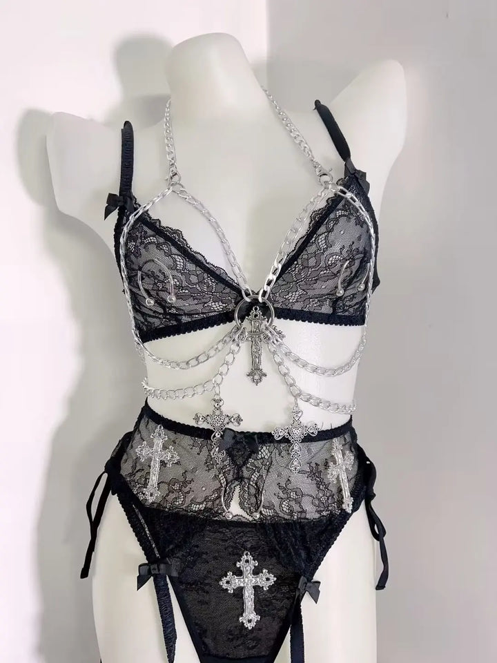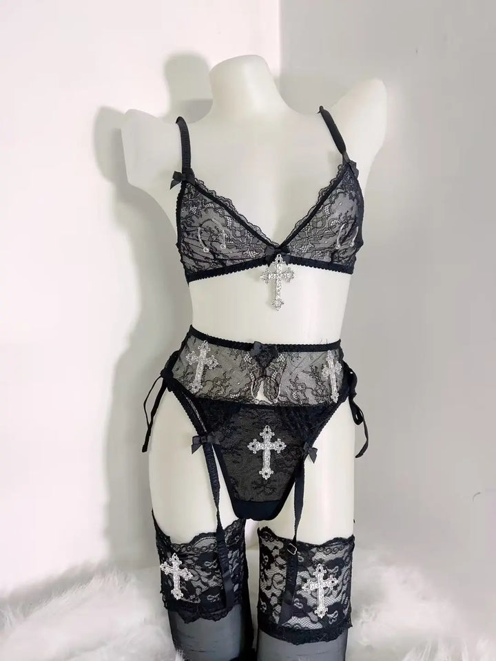 The lace bra shapes the body with delicate cups and slim straps. The matching bottoms pair with a detailed garter belt featuring a metallic cross charm for a striking gothic touch. The lace thigh pieces complete the look with dreamy, moody elegance.