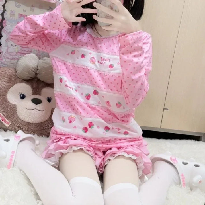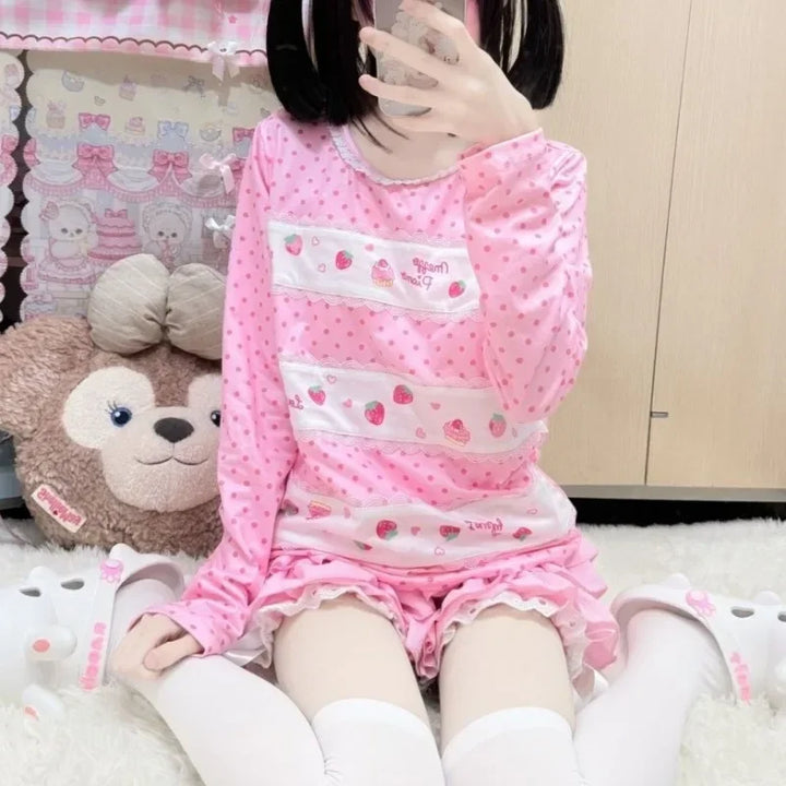 The lightweight, breathable fabric makes it comfortable enough for lounging or wearing out, while the long sleeves add a gentle, cozy feel. Its relaxed fit and ruffle hem detail make it perfect for pairing with skirts, bloomers, or your favorite pastel shorts for that full kawaii aesthetic.