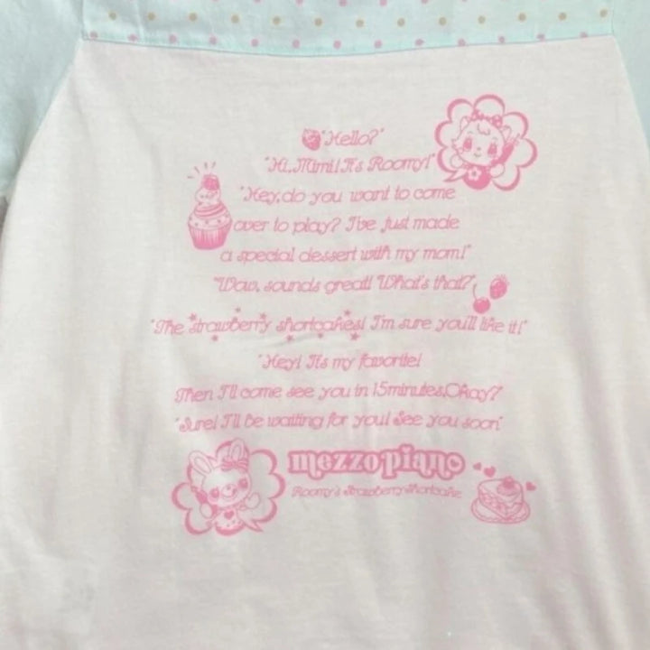 • 🎀 Sweet details – pastel polka-dot yoke, contrast collar trim, and vintage-inspired typography