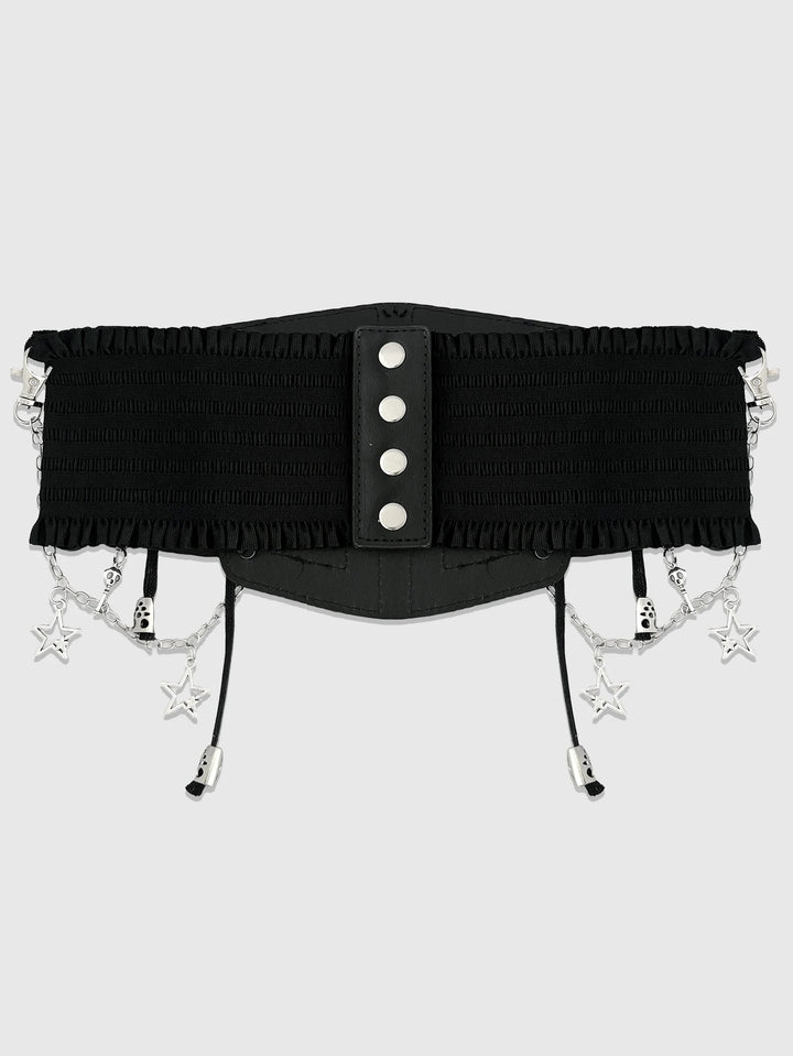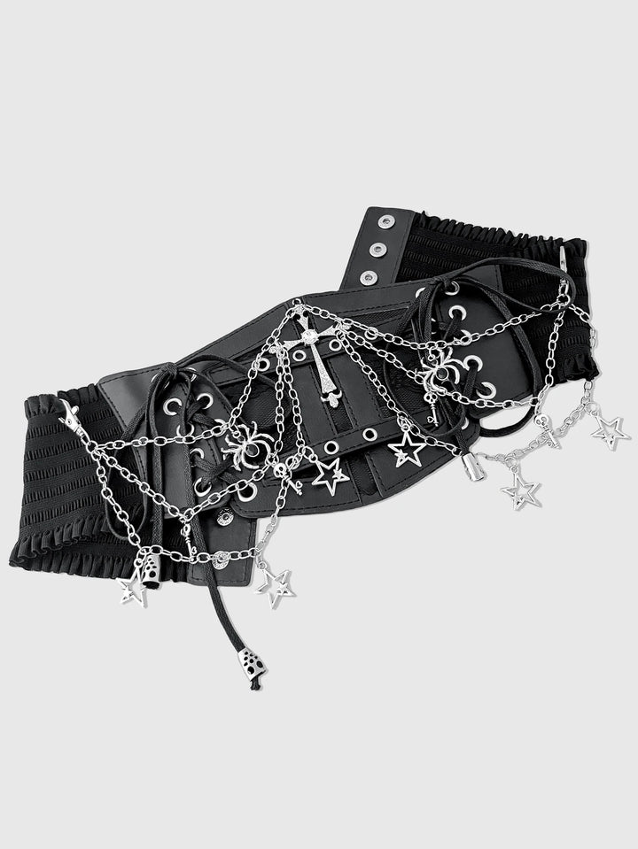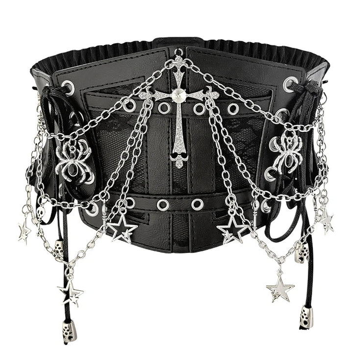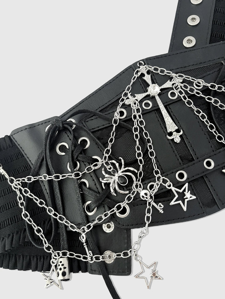 The structured faux-leather panel shapes the waist with a bold corset effect, while layered silver chains drape across the front like enchanted constellations. Star, moon, and cross charms sway with every movement, creating a shimmering celestial aura. The ruched elastic sides ensure a comfortable, snug fit while keeping the silhouette sharp and dramatic.