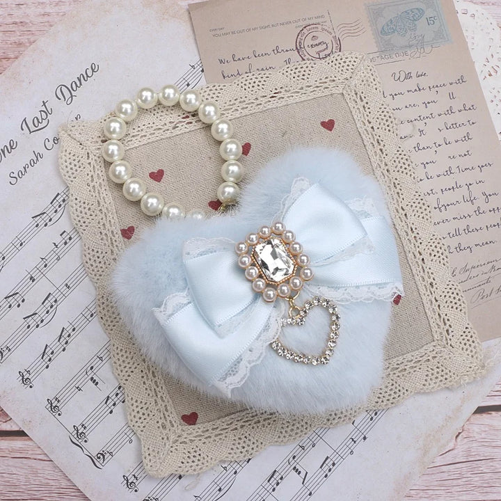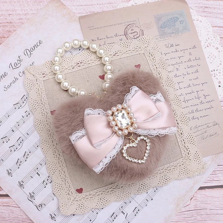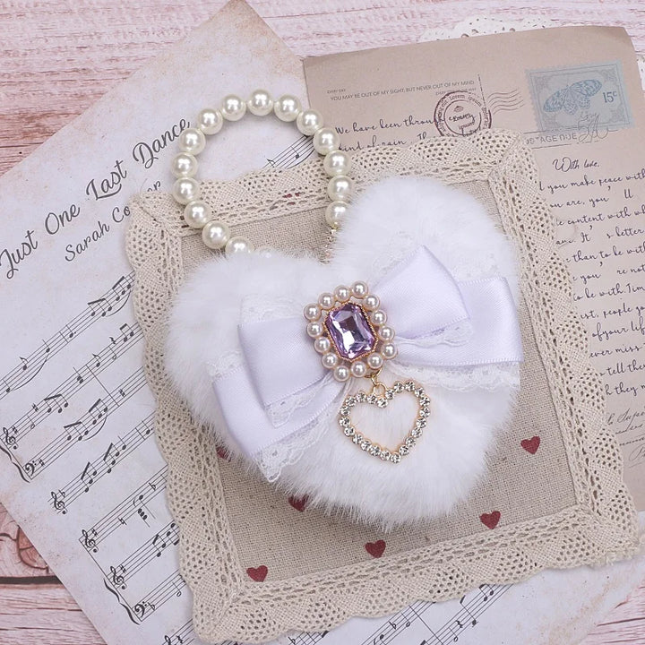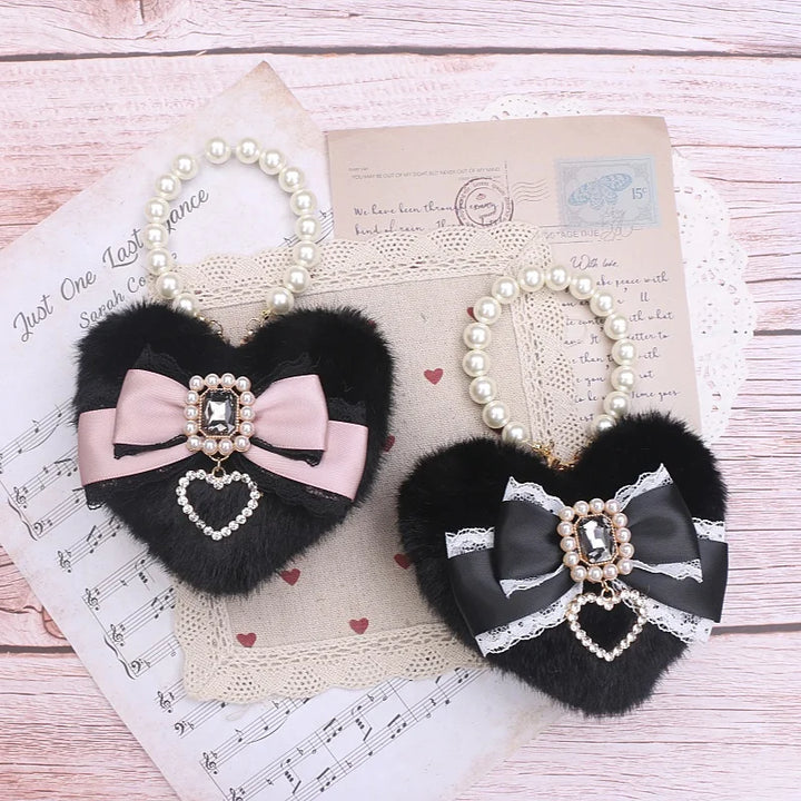 • Plush heart design β€” soft faux-fur heart with layered satin bows and lace trim for a dreamy lolita look.