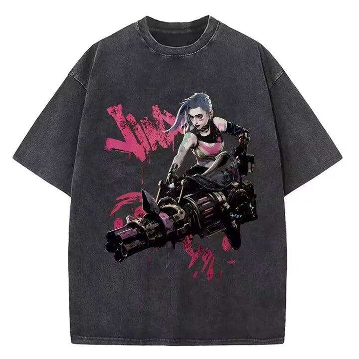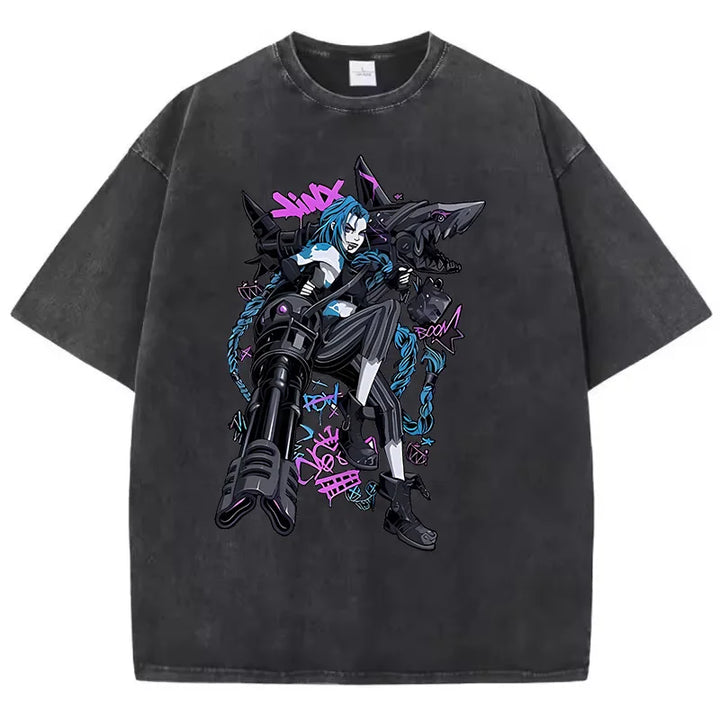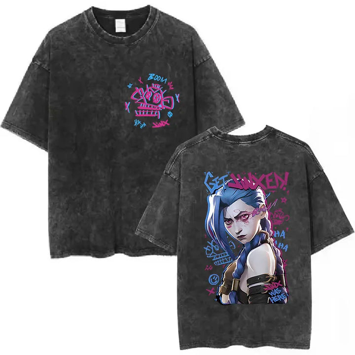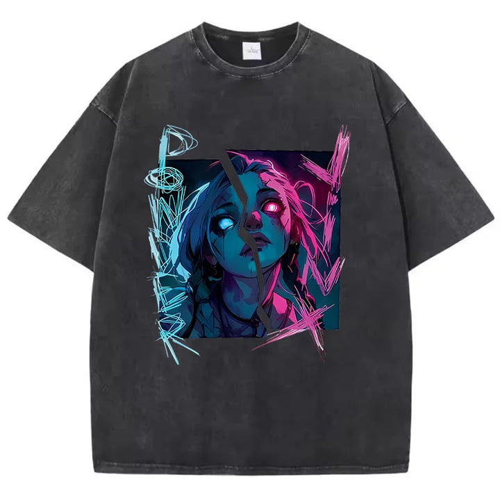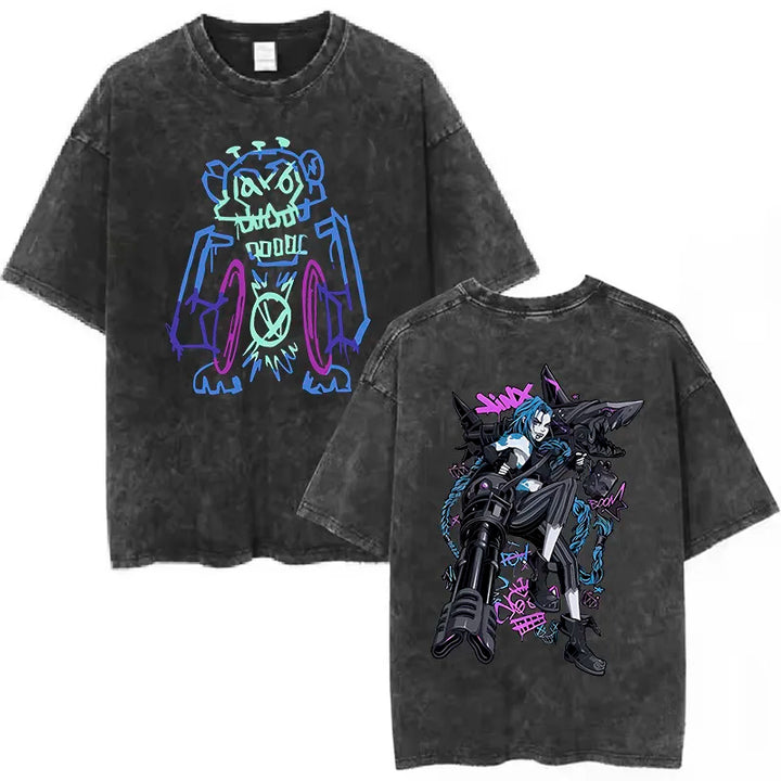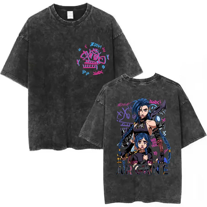 Bring the riot energy to your wardrobe with this Unisex Arcane Jinx Washed T-Shirt. Its grunge-washed base paired with vibrant neon artwork makes it perfect for both casual streetwear and bold fandom looks. (ノ◕ヮ◕)ノ*:・゚✧