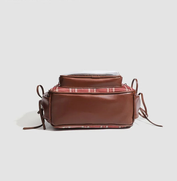 Classic plaid design β warm gingham checks combined with faux leather trim for instant vintage vibes.