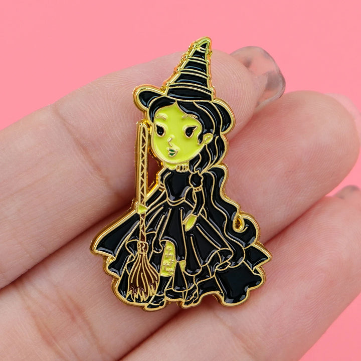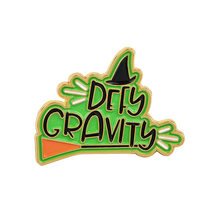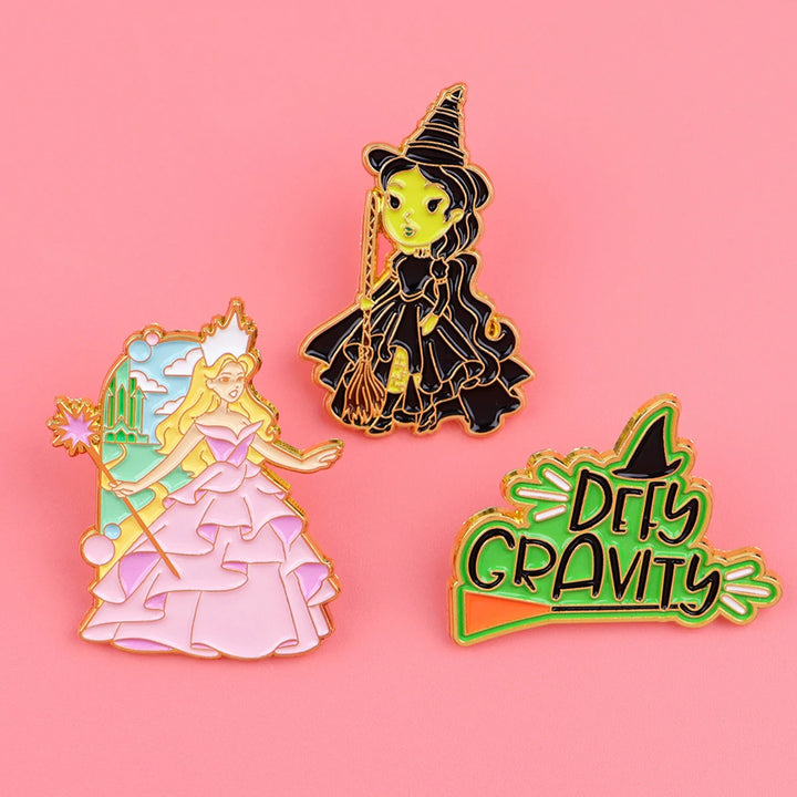 This Wicked-inspired enamel pin collection features iconic designs of the green witch, the pink good witch, the Emerald City, and the “Defy Gravity” quote. Each pin is crafted with smooth enamel, vibrant colors, and gold-tone metal outlines for a bold, magical finish.