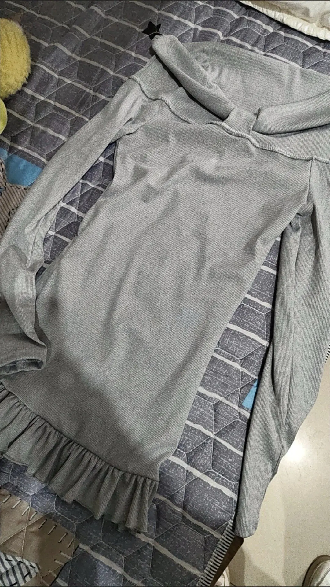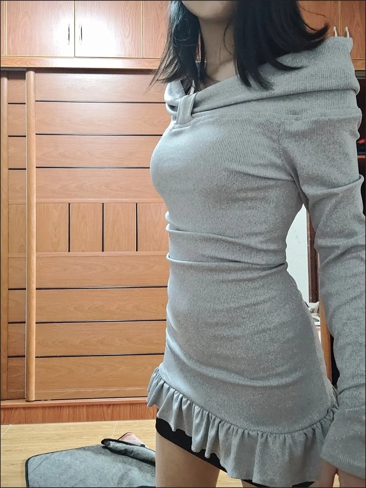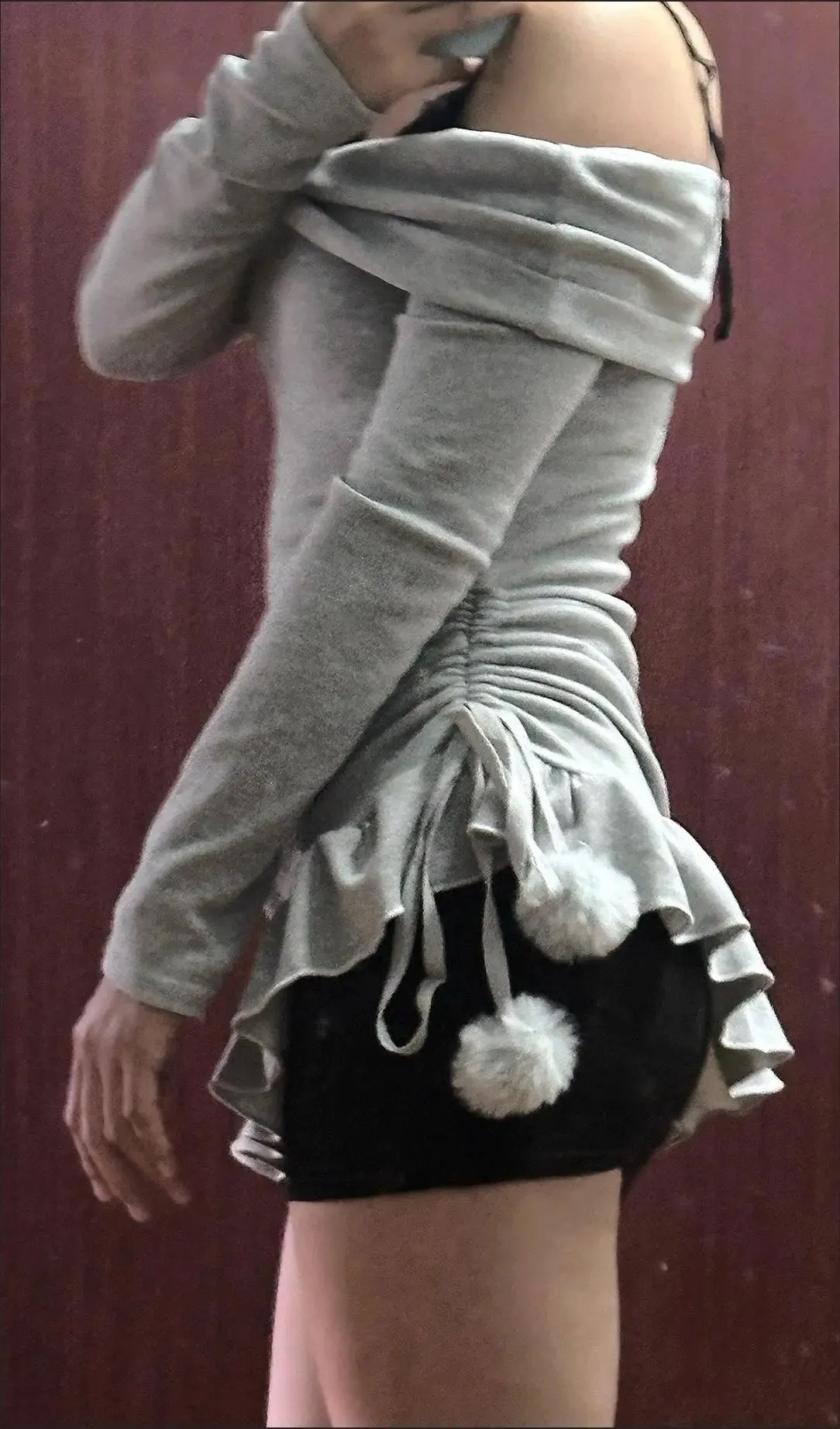 Velvet Off-Shoulder Sweater Dress: A luxurious velvet-textured dress in a soft grey hue, featuring an off-shoulder design, black lace bust detail, and a ruffled hem. Tied at the waist with fluffy pom-pom side strings for an adjustable, playful fit! ๐โ๏ธ